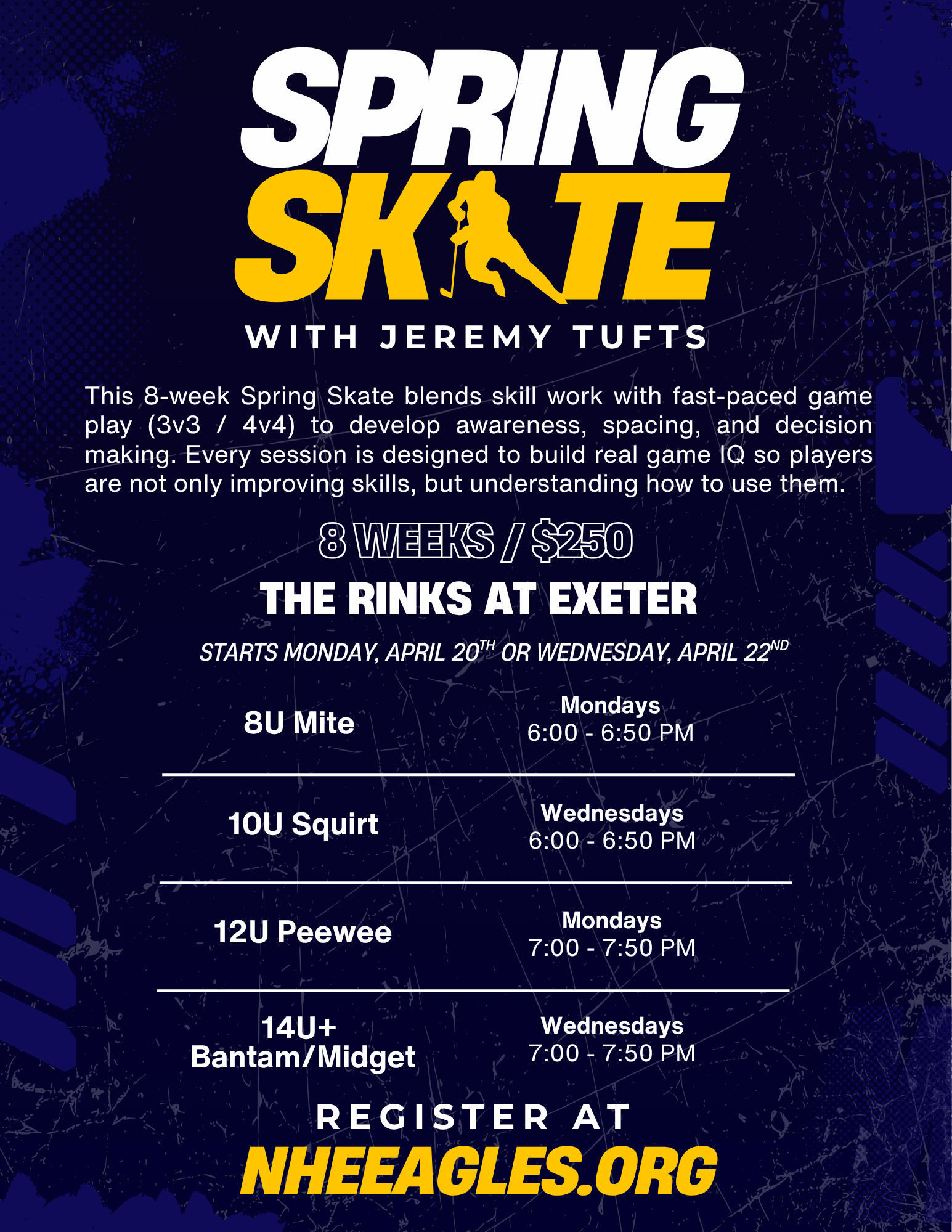 Spring Skate is an 8-week program built to go beyond just skill drills. Each session blends individual skill work with fast-paced game play (3v3 / 4v4) to help players improve awareness, spacing, decision making, and overall game IQ so they can better understand how to use their skills in real game situations.